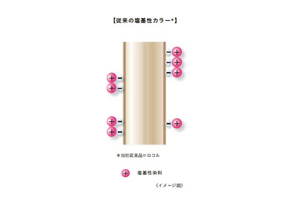 従来の塩基性カラーは、プラス(+)の電荷をもつ塩基性染料がマイナス(-)の電荷を帯びた毛髪と電気的に引き合い、吸着して染まります(イオン結合)。
